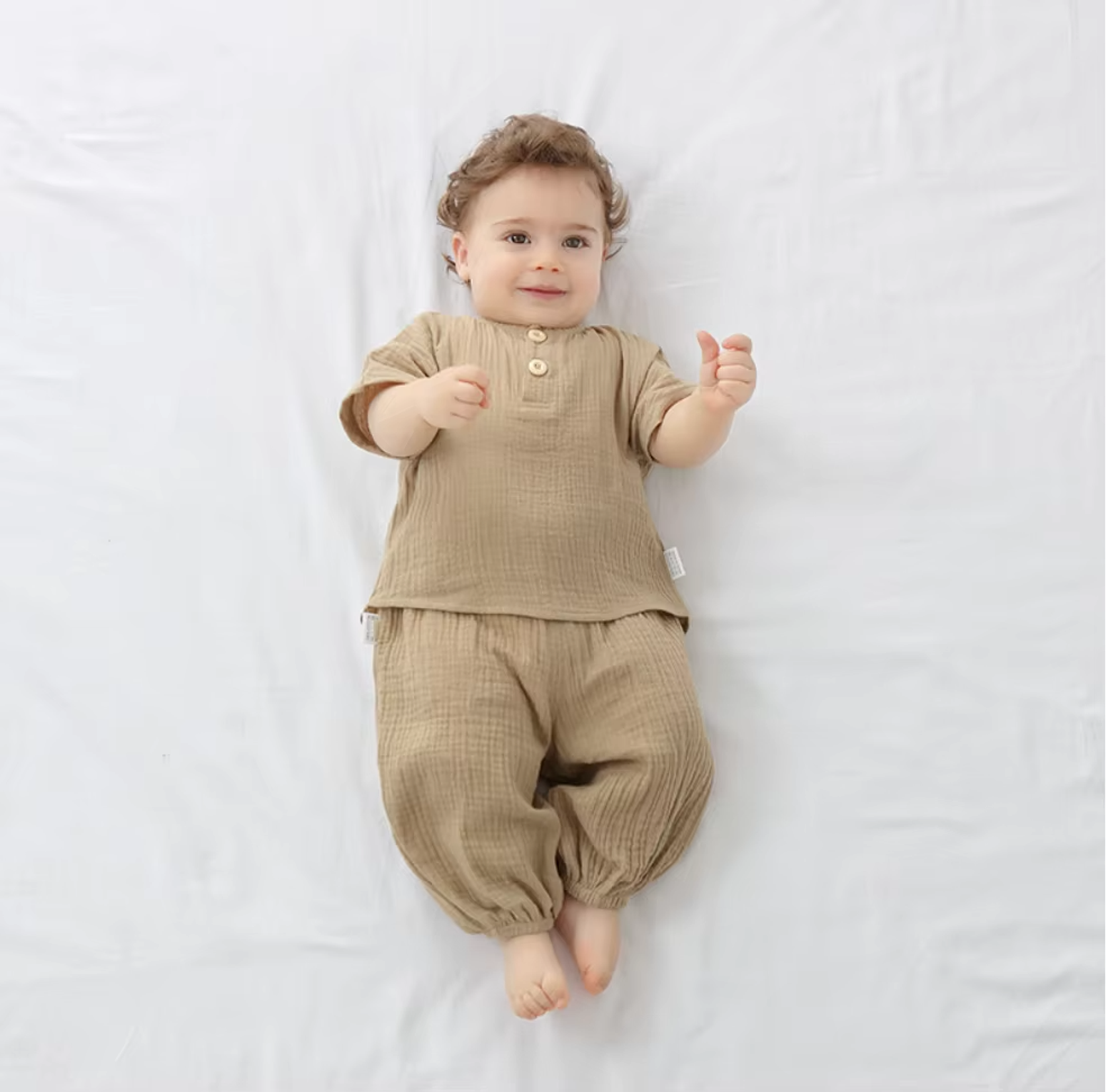 Made from soft, breathable muslin cotton, this two-piece set includes a relaxed button-front top and elastic-waist pants that allow easy movement without irritating delicate skin. The lightweight fabric keeps babies cool and cosy, making it ideal for both warm days and layering on cooler days.