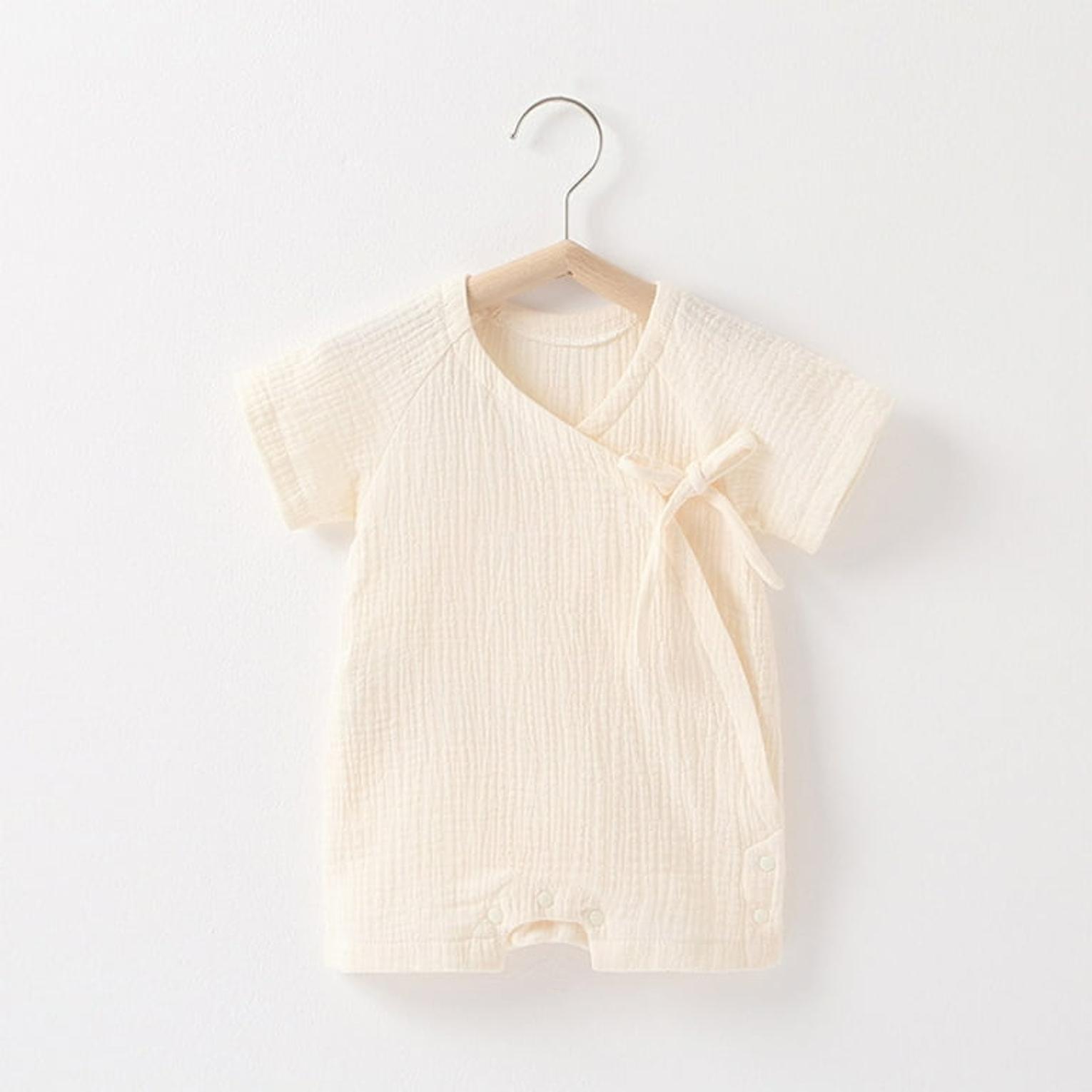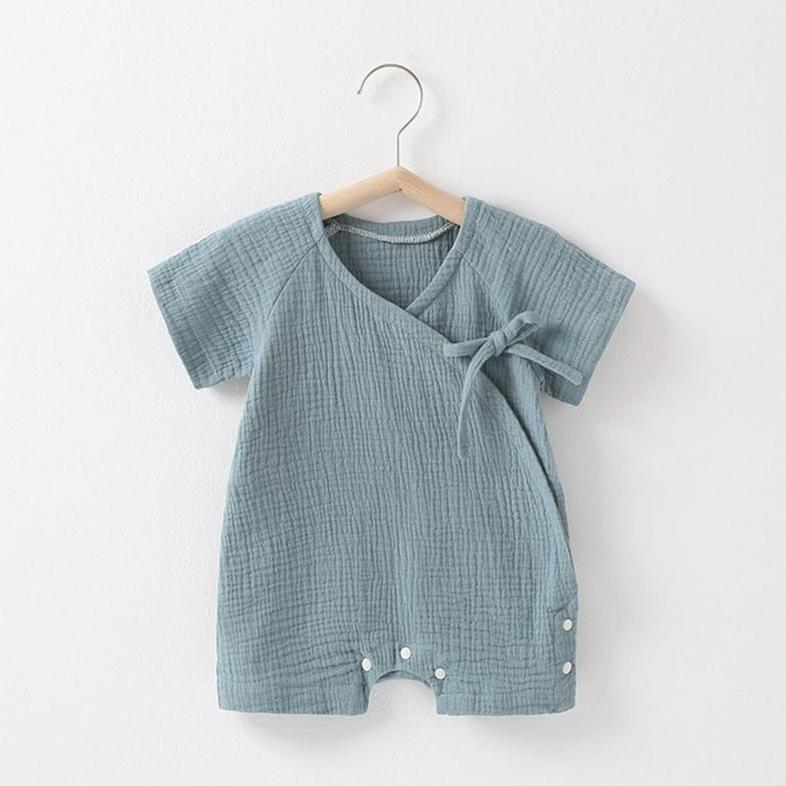 Crafted from breathable, lightweight muslin cotton, it helps regulate your baby’s temperature while remaining soft and gentle on delicate skin. The adjustable side ties and snap buttons make diaper changes quick and convenient, ensuring comfort for both baby and parent.