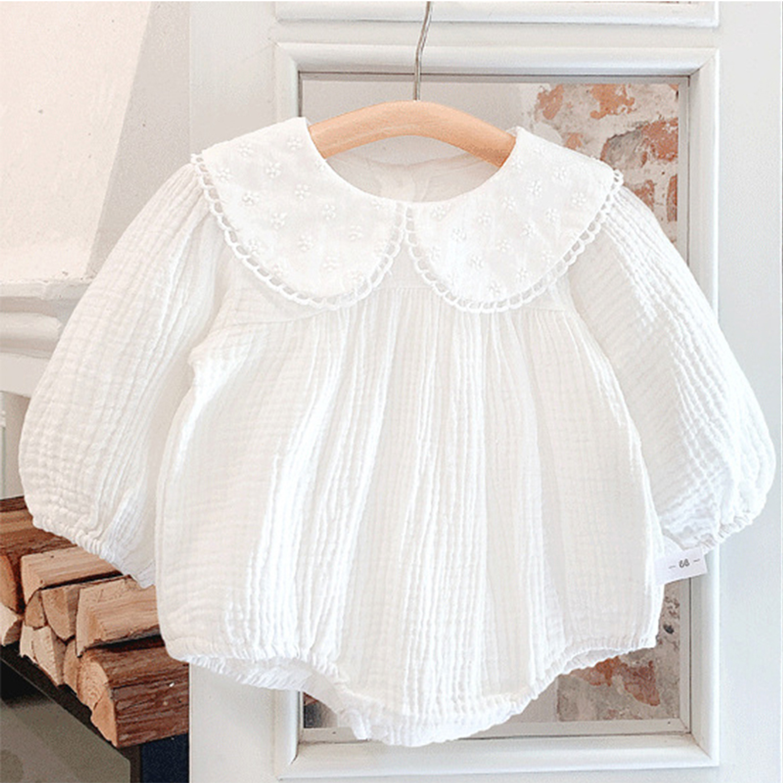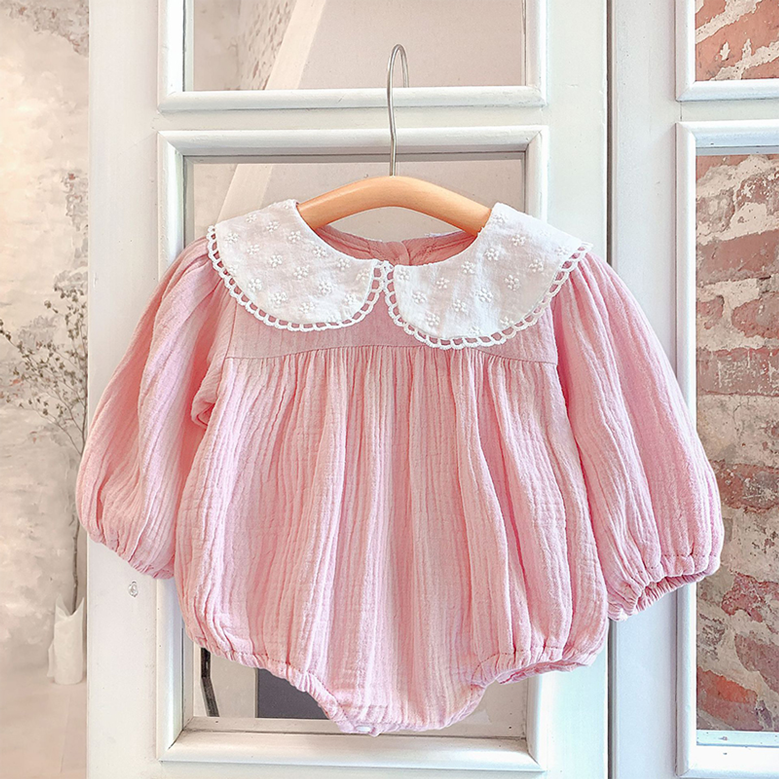 The beautiful embroidered lace collar adds a sweet, classic touch, while the long puff sleeves and airy muslin texture keep your baby cozy without overheating. Designed with easy snap closures at the bottom, changing time becomes quick and stress-free.