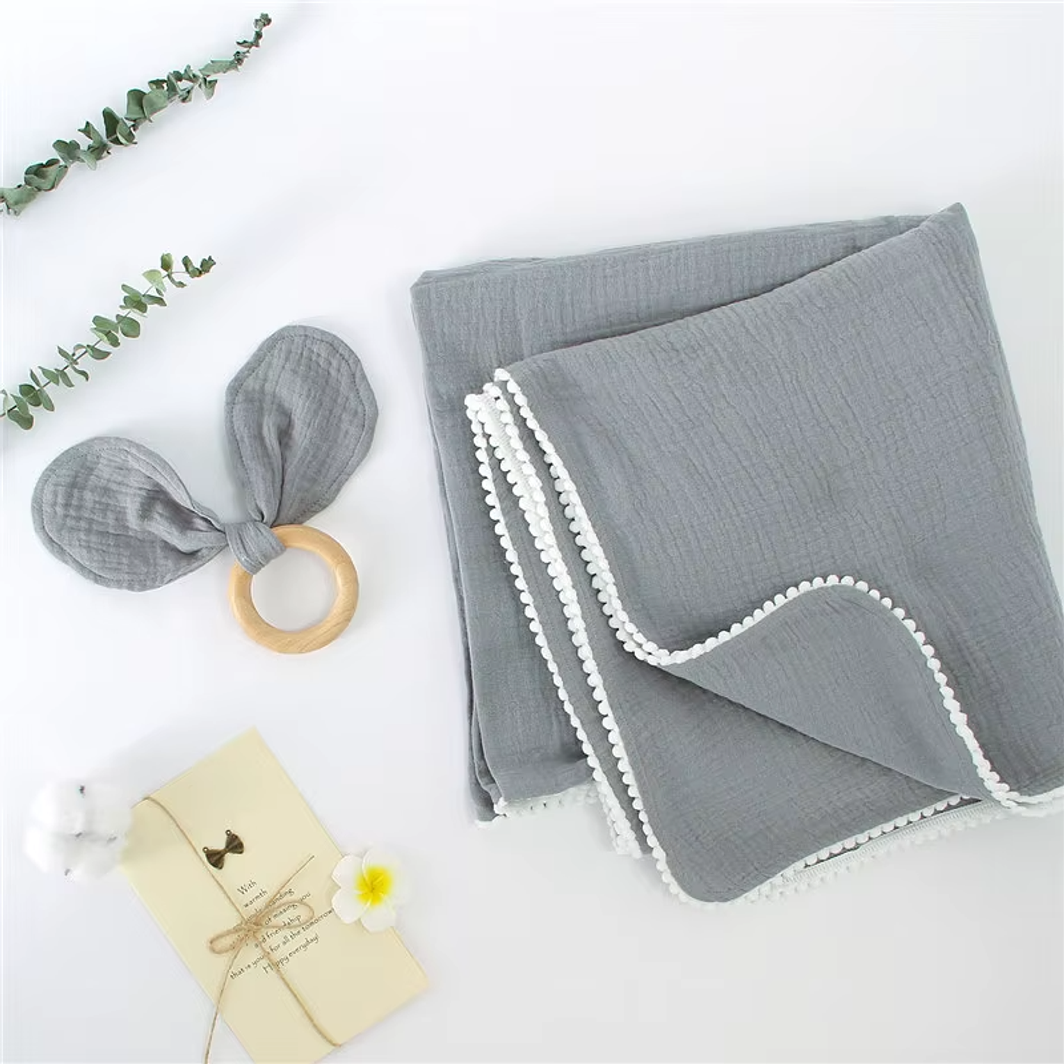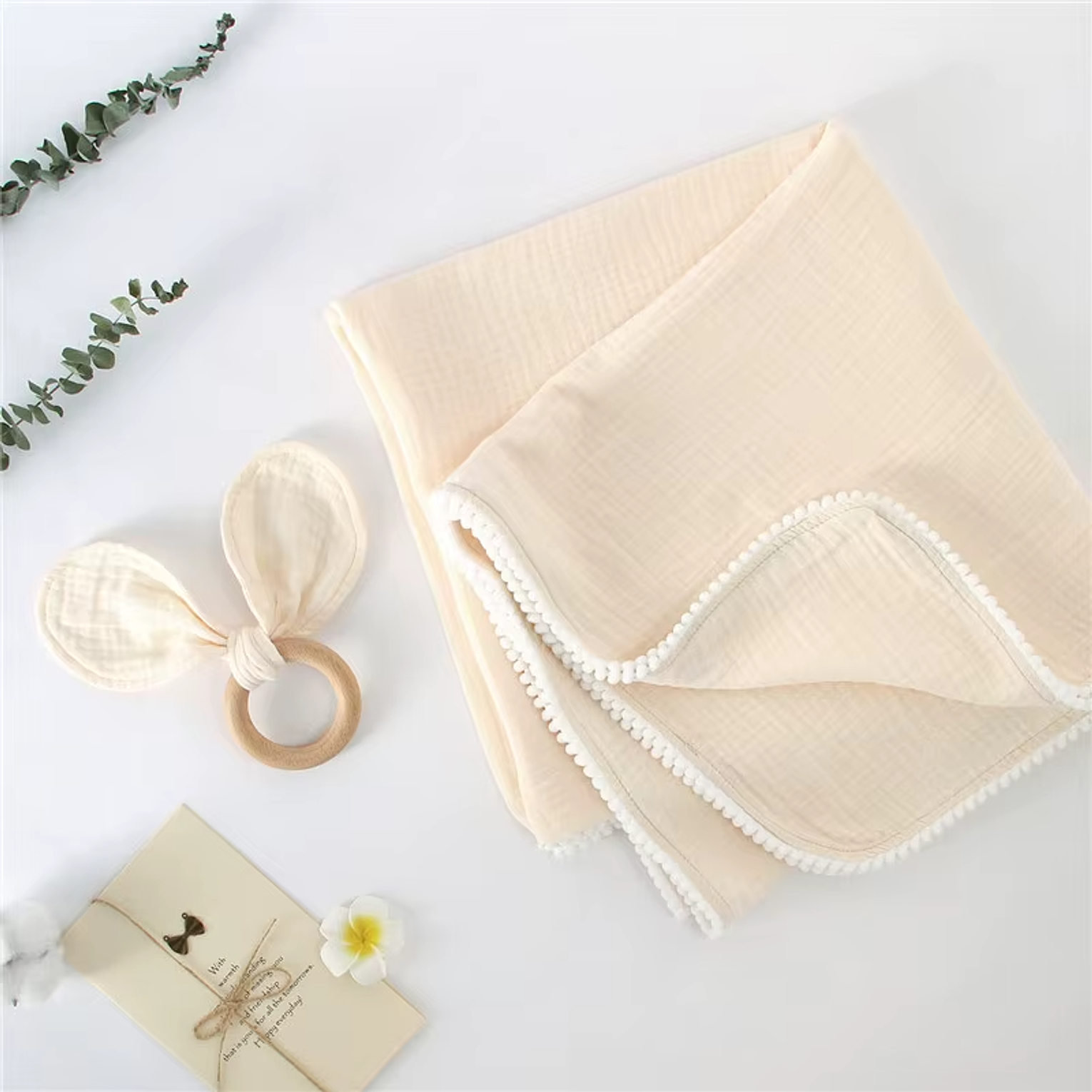 Crafted from lightweight, breathable muslin cotton, this generously sized 120cm × 120cm blanket is perfect for swaddling, snuggling, tummy time, or as a cozy stroller cover. The delicate pompom edging adds a timeless, elegant touch while keeping the look soft and minimal.