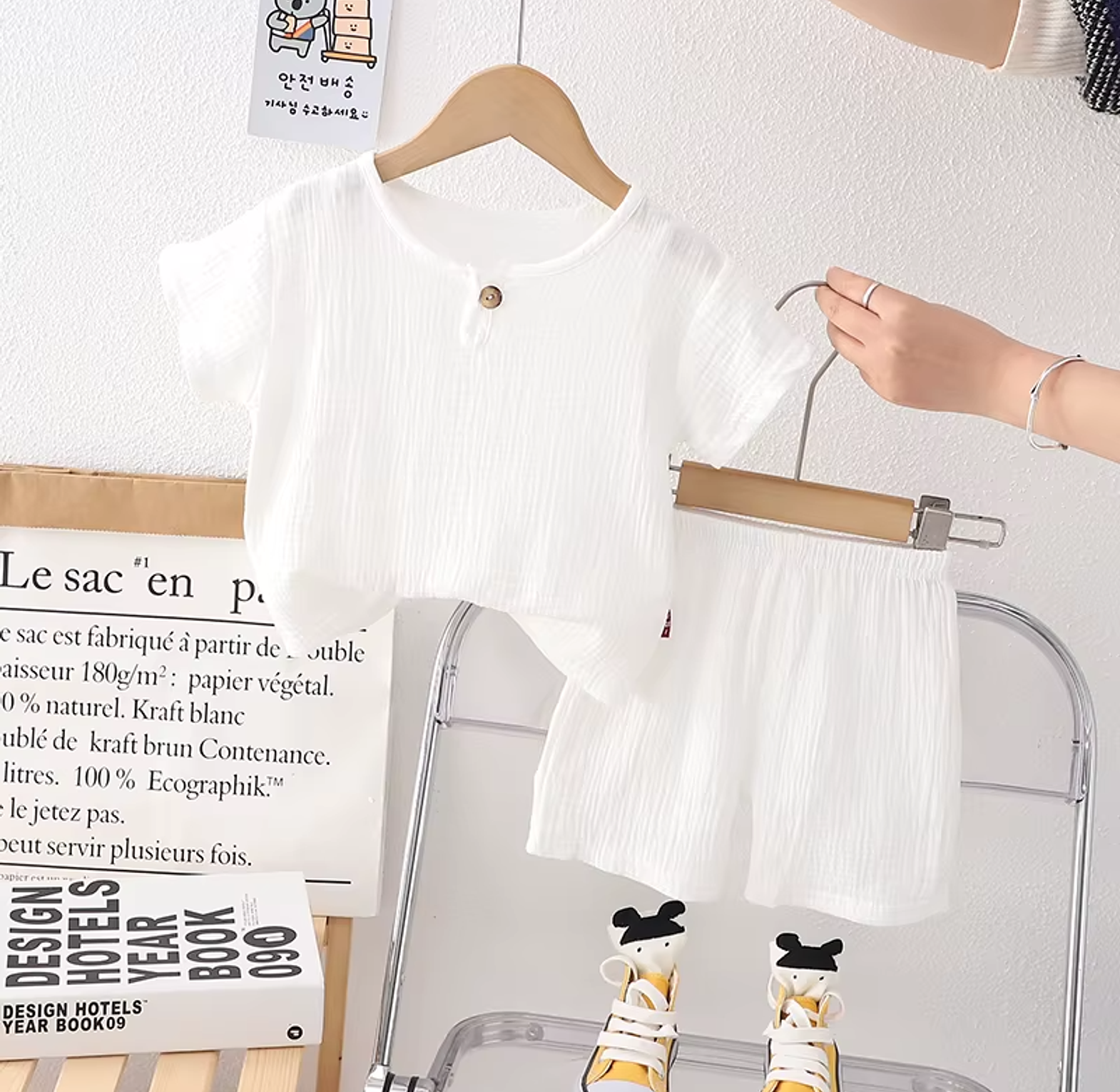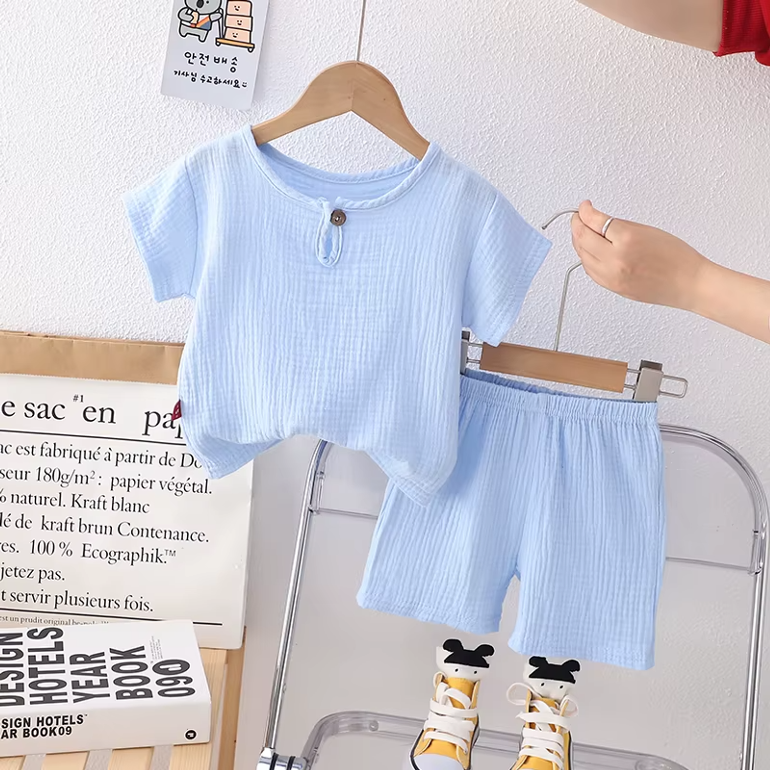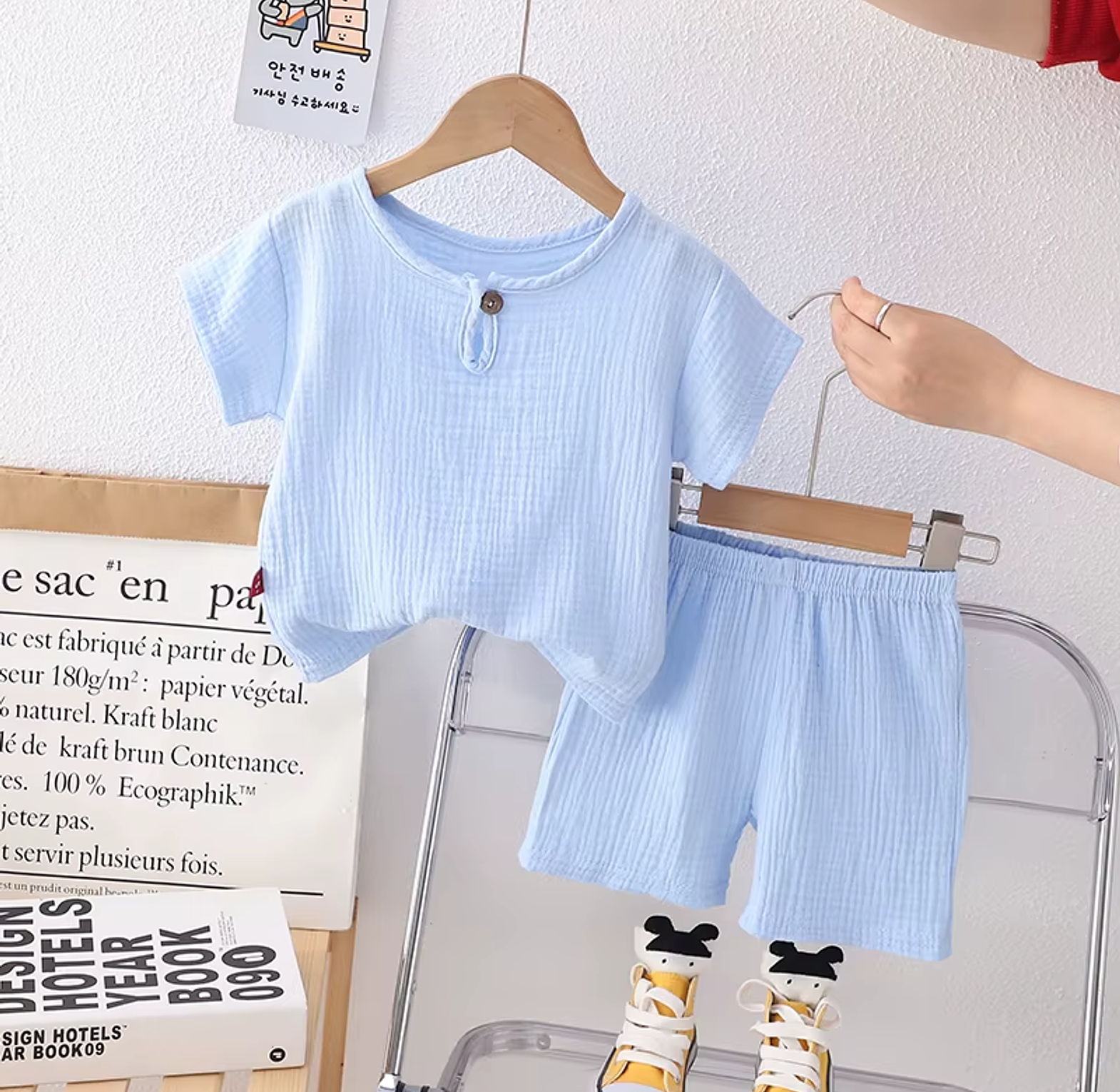 The Sunny Skies Boys Short Set is made from 100% muslin cotton, offering a perfect balance of comfort and durability. Gentle on delicate skin and lightweight for all-day wear, this set is ideal for playtime, outings, and warm weather. A wardrobe essential for moms looking for stylish, breathable, and long-lasting baby clothes.