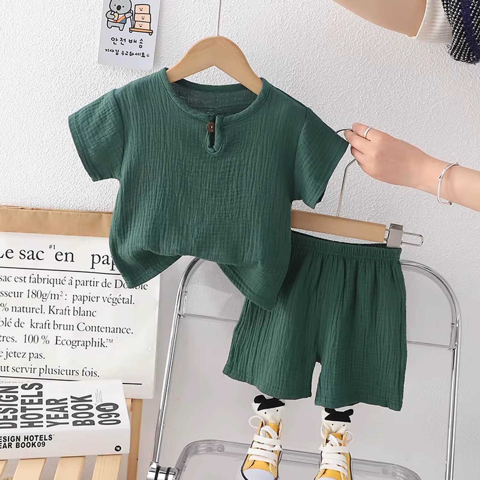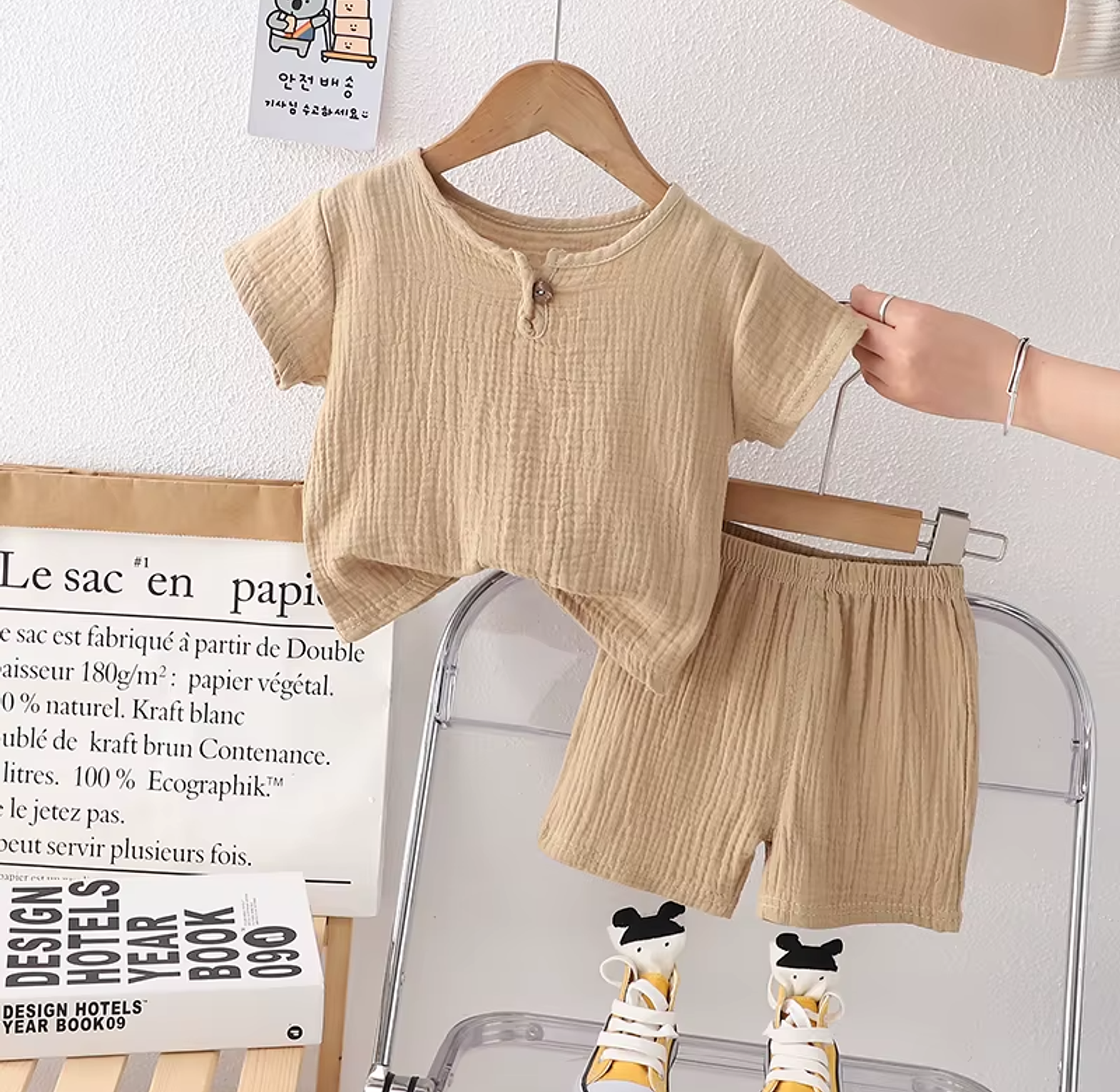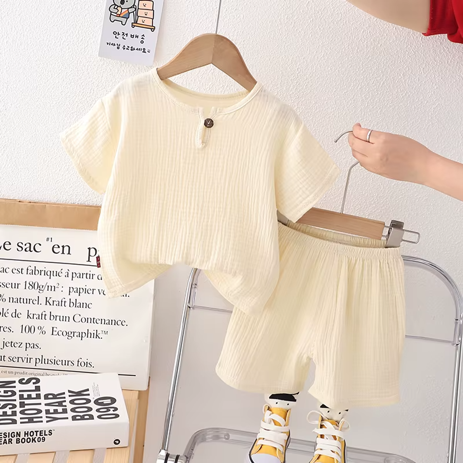 The Sunny Skies Boys Short Set is made from 100% muslin cotton, offering a perfect balance of comfort and durability. Gentle on delicate skin and lightweight for all-day wear, this set is ideal for playtime, outings, and warm weather. A wardrobe essential for moms looking for stylish, breathable, and long-lasting baby clothes.