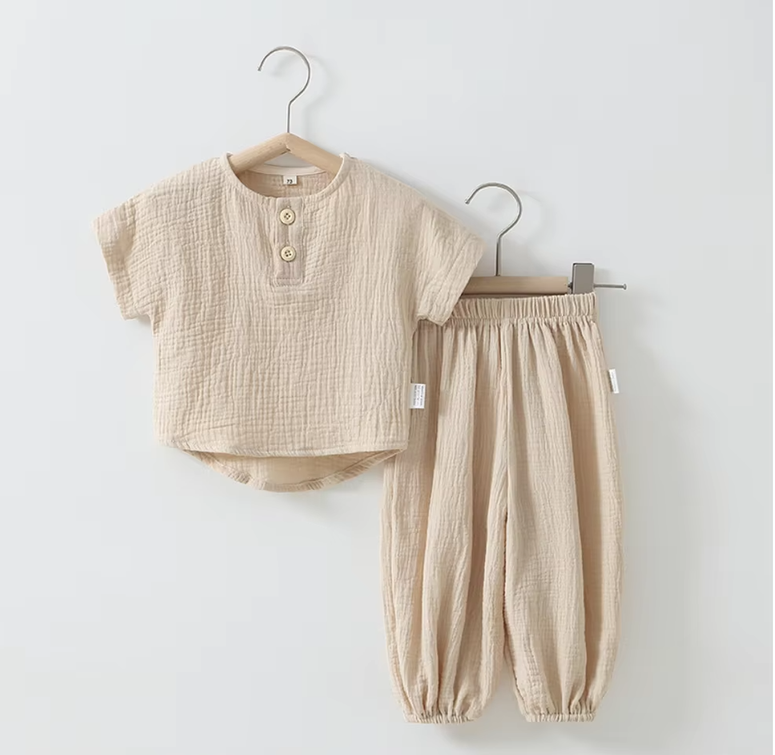 Made from soft, breathable muslin cotton, this two-piece set includes a relaxed button-front top and elastic-waist pants that allow easy movement without irritating delicate skin. The lightweight fabric keeps babies cool and cosy, making it ideal for both warm days and layering on cooler days.