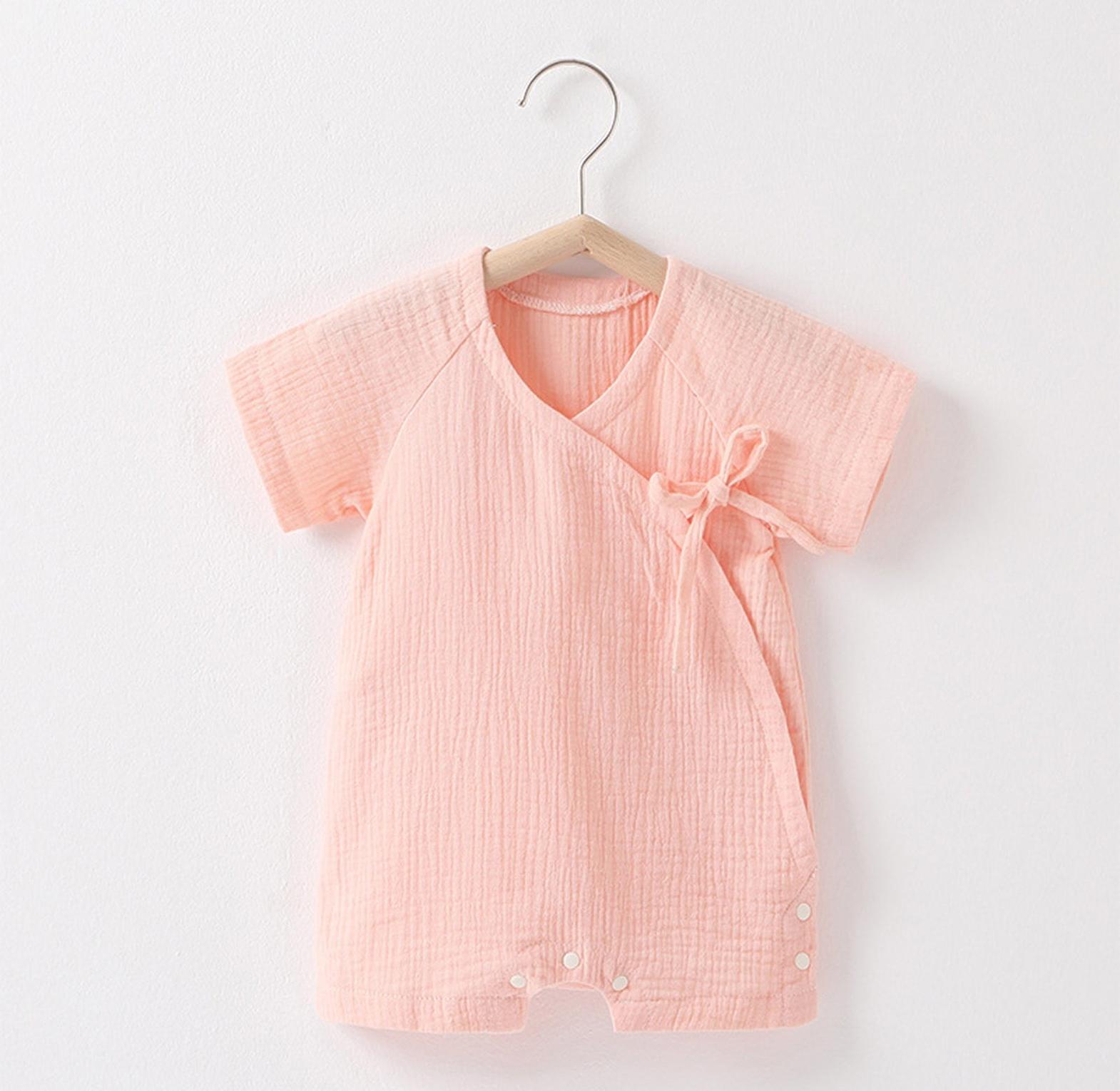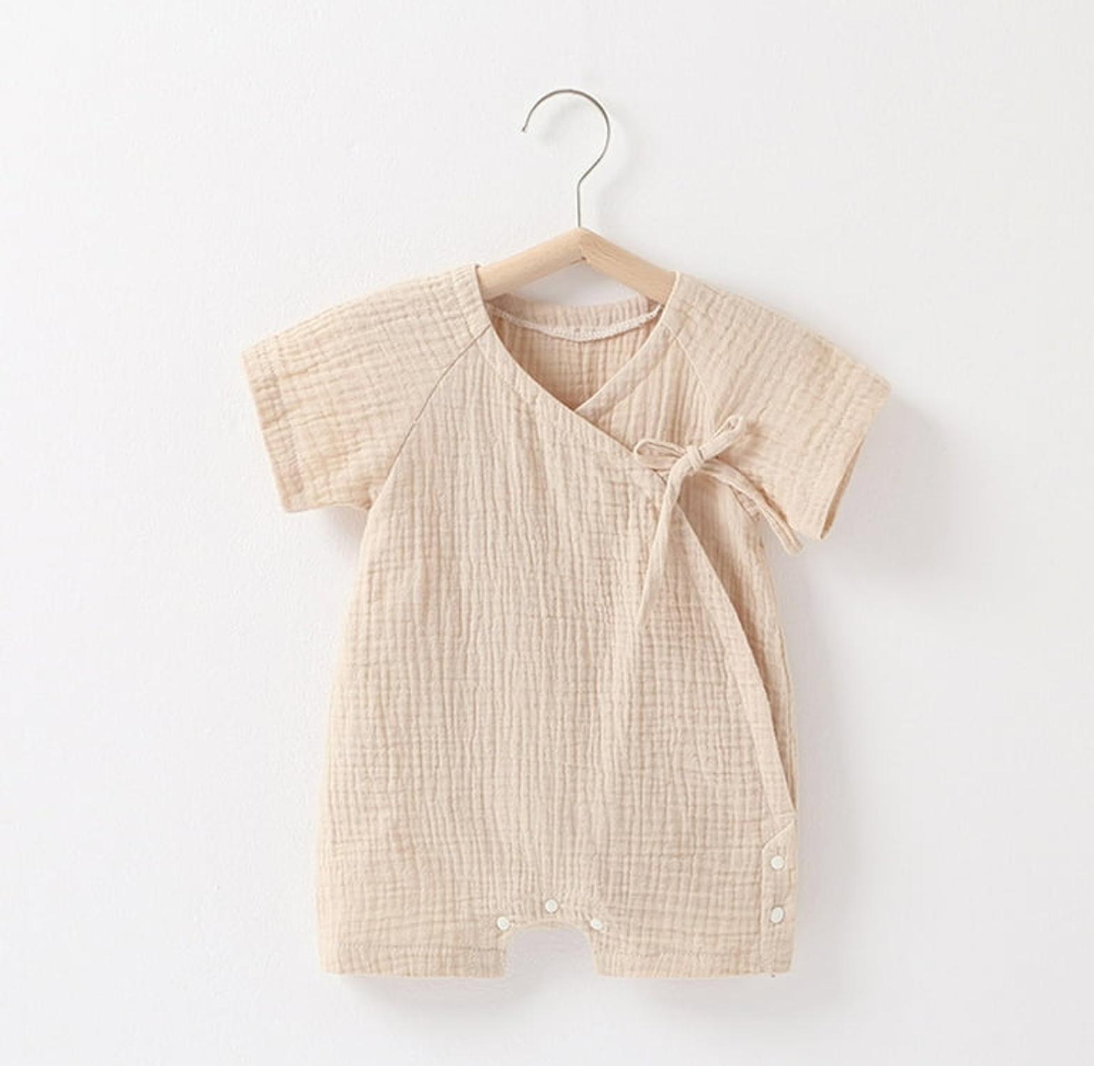Crafted from breathable, lightweight muslin cotton, it helps regulate your baby’s temperature while remaining soft and gentle on delicate skin. The adjustable side ties and snap buttons make diaper changes quick and convenient, ensuring comfort for both baby and parent.