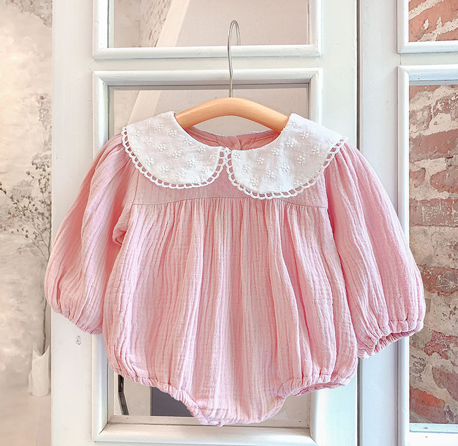 The beautiful embroidered lace collar adds a sweet, classic touch, while the long puff sleeves and airy muslin texture keep your baby cozy without overheating. Designed with easy snap closures at the bottom, changing time becomes quick and stress-free.