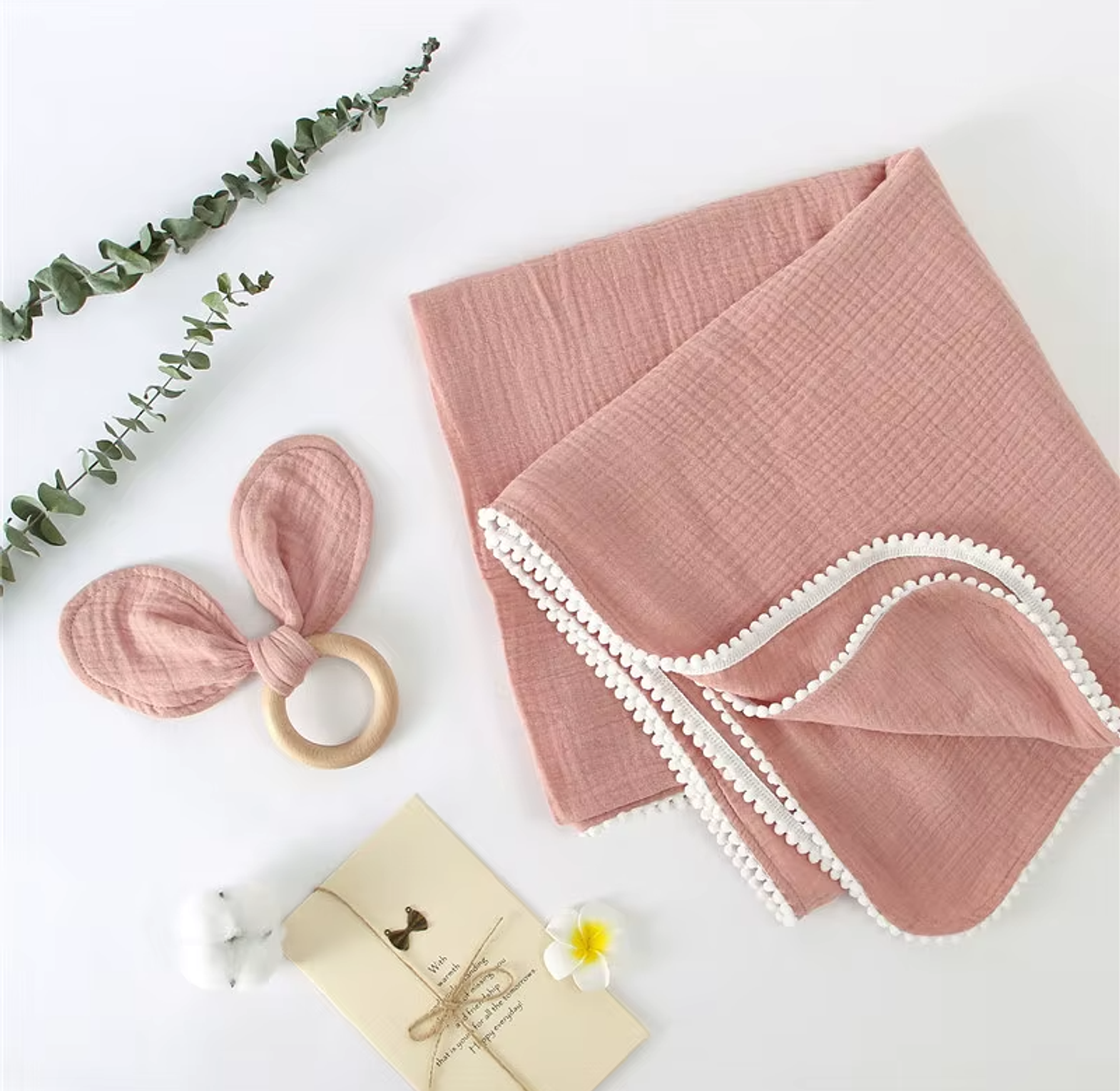 Wrap your little one in comfort with our Muslin Pompom Blanket & Wooden Teether Set, thoughtfully designed for newborns and young babies.