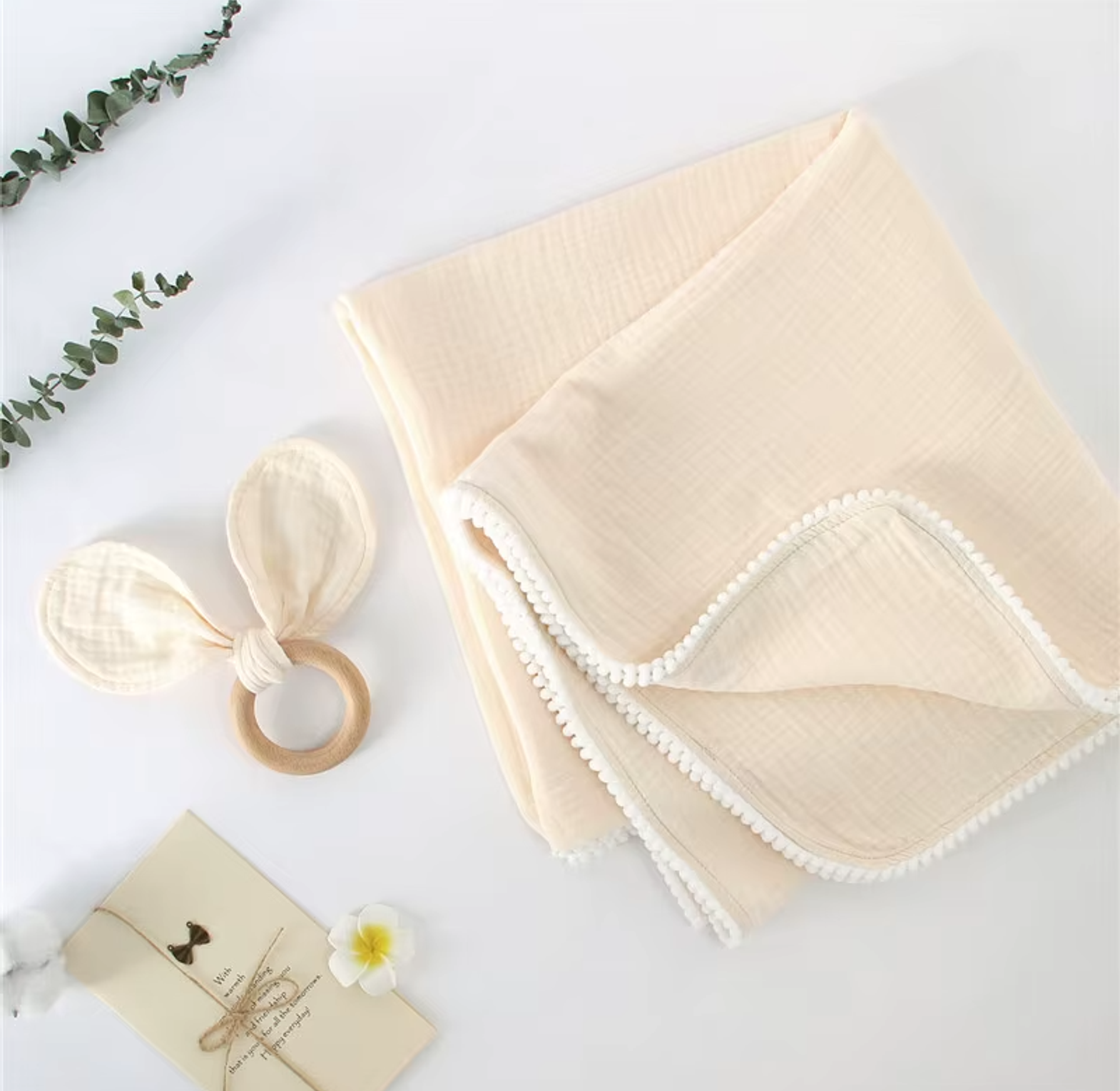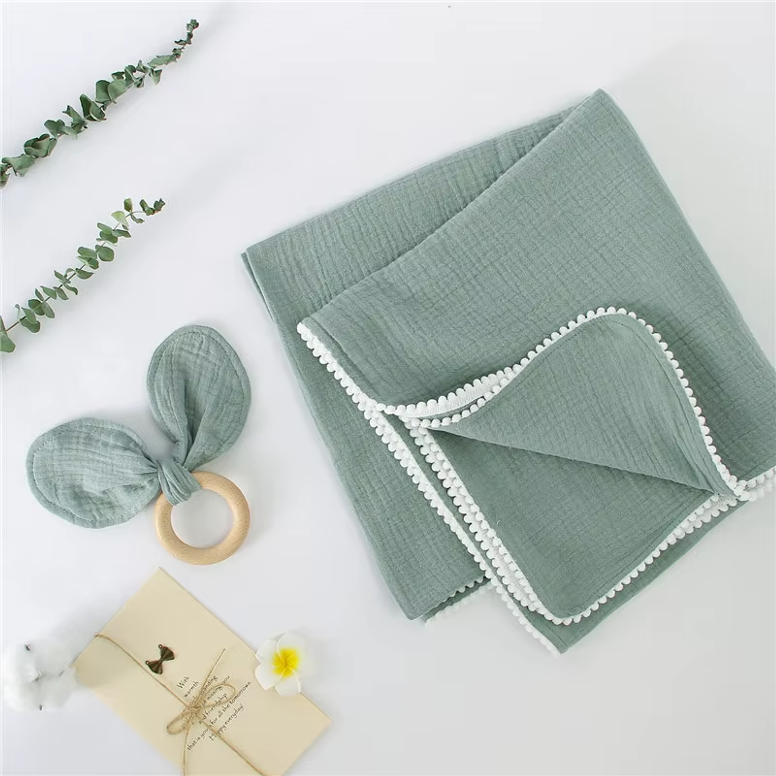 Crafted from lightweight, breathable muslin cotton, this generously sized 120cm × 120cm blanket is perfect for swaddling, snuggling, tummy time, or as a cozy stroller cover. The delicate pompom edging adds a timeless, elegant touch while keeping the look soft and minimal.
