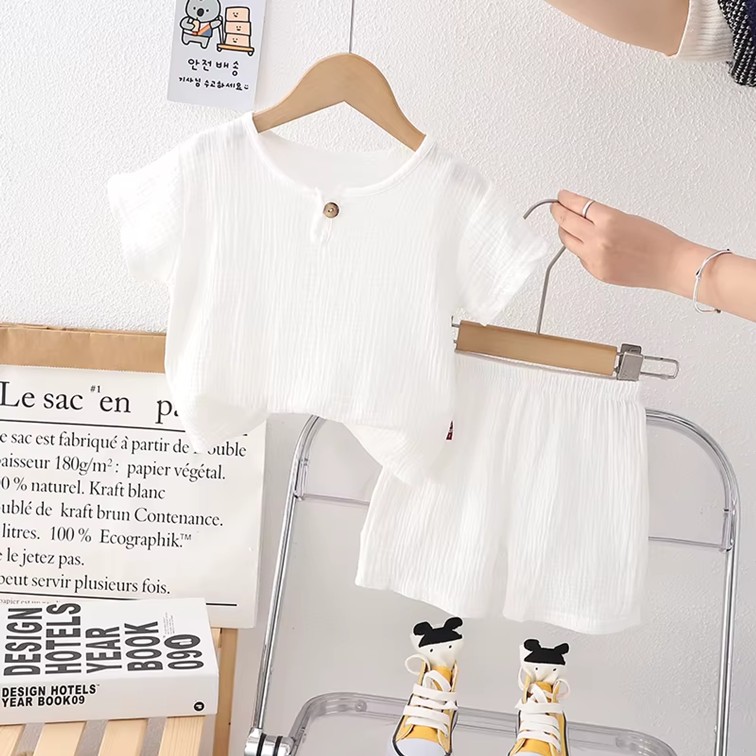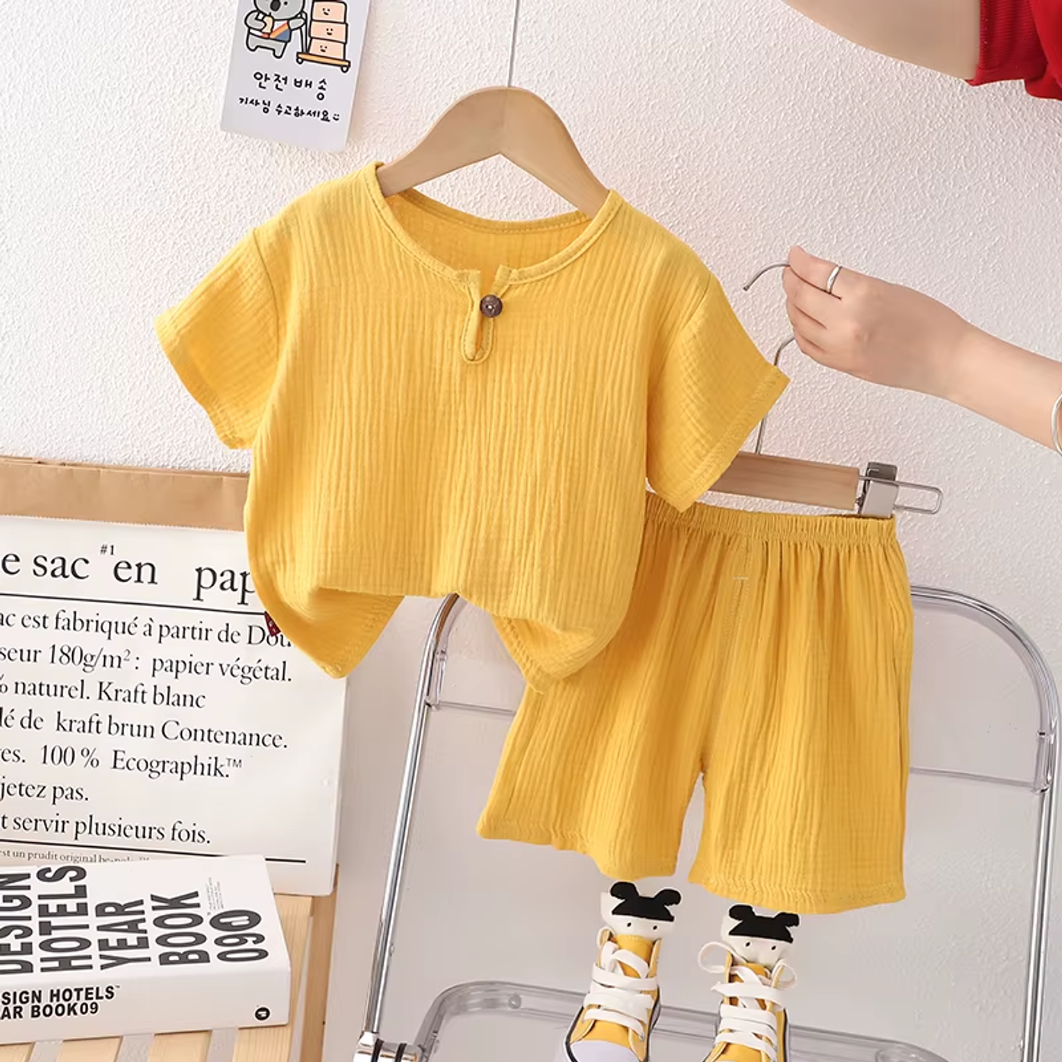 The Sunny Skies Boys Short Set is made from 100% muslin cotton, offering a perfect balance of comfort and durability. Gentle on delicate skin and lightweight for all-day wear, this set is ideal for playtime, outings, and warm weather. A wardrobe essential for moms looking for stylish, breathable, and long-lasting baby clothes.